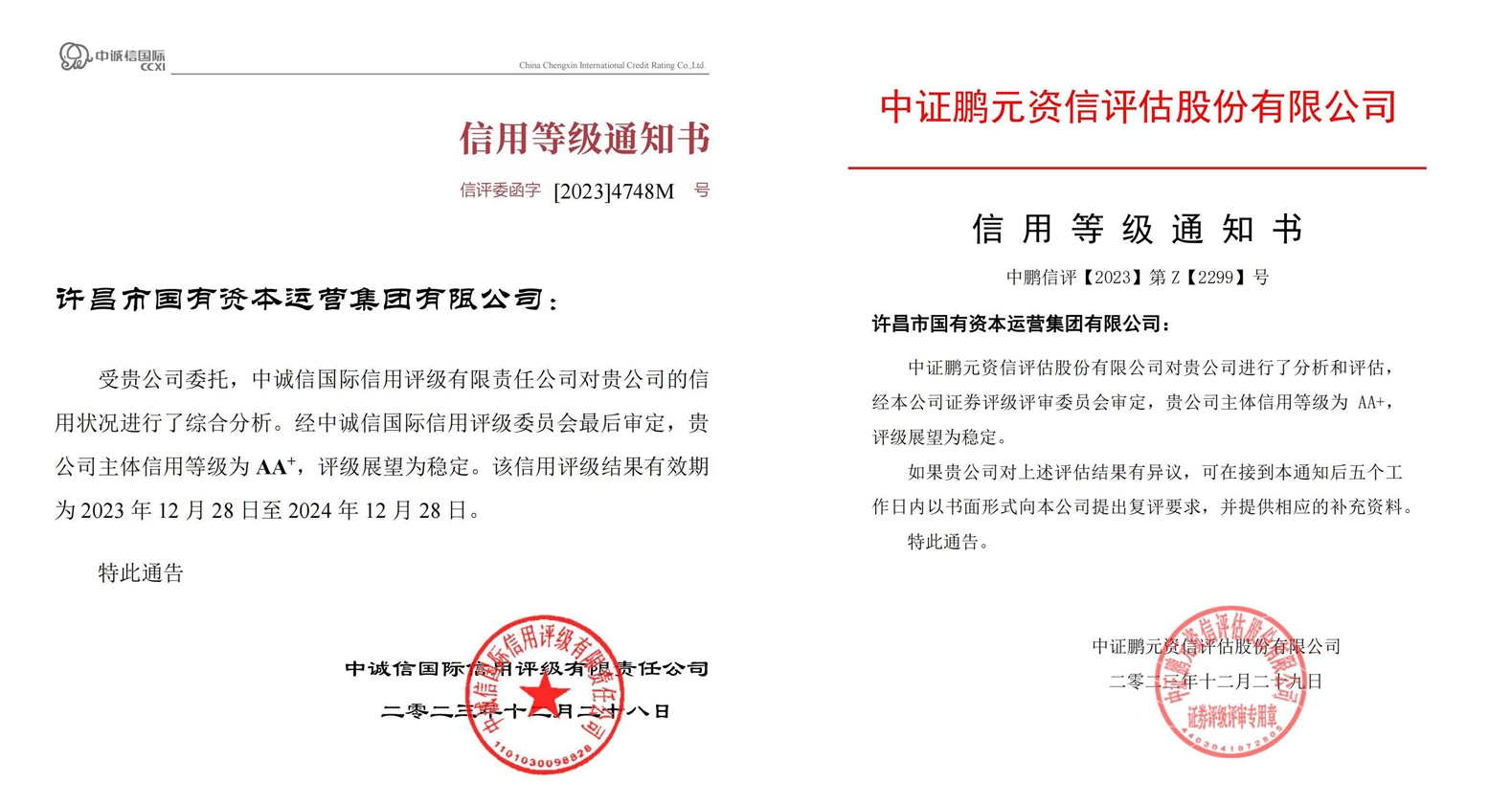 2023年12月28日、12月29日,經(jīng)國內(nèi)權(quán)威評級機構(gòu)中誠信國際信用評級有限責任公司、中證鵬元資信評估股份有限公司專業(yè)評定,許昌市國有資本運營集團有限公司先后獲得AA+主體信用評級,評級展望為穩(wěn)定。